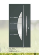 PREZO Lisene 111 Aluminium-Füllung, flügelüberdeckend, Außenansicht rechts, einseitig Alu-Nox Lisene flächenbündig, VSG-Glas gesandstrahlt Design Nr. 20 Ug 1,1, Oberfläche RAL 7012*, Türgriff Edelstahl mit polierter Ziernut WE 28 / 1000 mm 6