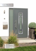 Serie PREZO PREZO 01 Aluminium-Füllung, flügelüberdeckend, Ornamentrahmen Edelstahloptik (Alu-Nox) beidseitig, VSG-Glas gesandstrahlt Design Nr. 02 Ug 1,1, Oberfläche RAL 7023*, Türgriff Edelstahl TG 9 45° / 800 mm 8